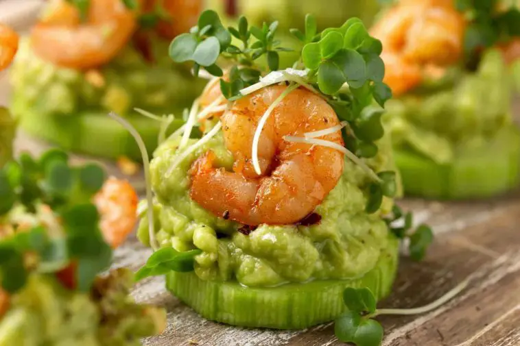 Shrimp appetizers with avocado and cucumber are a delightful culinary creation that has gained popularity for both their taste and health benefits. This dish combines the succulent flavors of shrimp with the creamy texture of avocado and the crisp freshness of cucumber, creating a harmonious blend of flavors and textures. Ideal for gatherings, parties, or as a healthy snack, these appetizers are not only delicious but also visually appealing. They cater to a variety of dietary preferences, including gluten-free, keto, and paleo diets. The ease of preparation and the nutritional value of the ingredients make this dish a favored choice for health-conscious food enthusiasts. Its growing popularity is a testament to its ability to balance gourmet taste with nutritional benefits, making it a perfect choice for a sophisticated yet healthy appetizer.